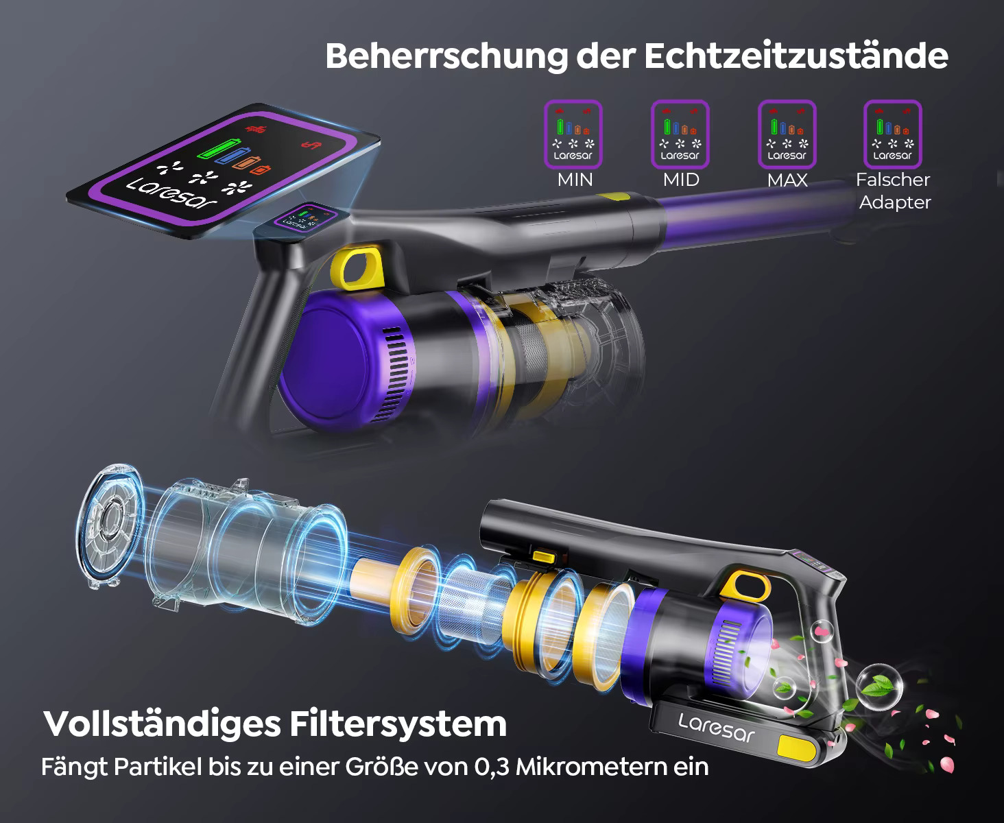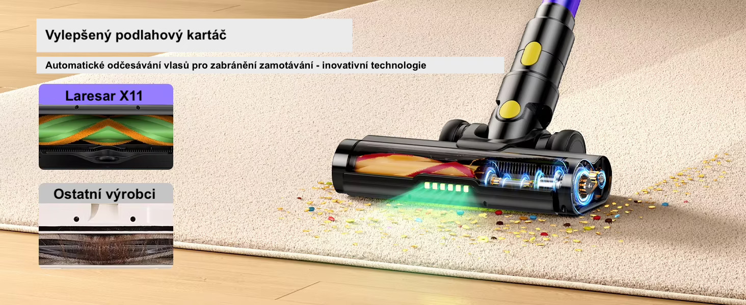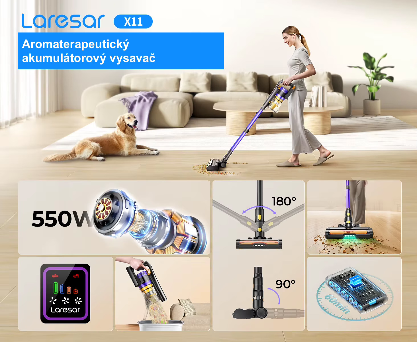 Laresar X11 je nejnovější generace moderního bezdrátového tyčového vysavače navržená pro efektivní úklid domácnosti, kanceláře i interiéru automobilu. Díky silnému motoru o výkonu 550 W poskytuje neuvěřitelnou sací sílu 55 000 Pa, takže si bez problémů poradí s prachem, chlupy, drobnými nečistotami, pískem i tvrdými usazeninami v kobercích.